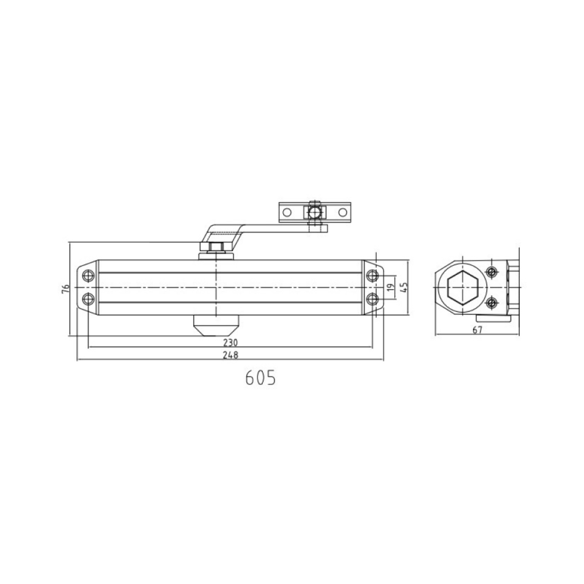 Дверний доводчик; конструкція тяги – складаний важіль; маса дверного полотна 85-120 кг; розміри 248 / 45 / 72 мм; колір графітовий