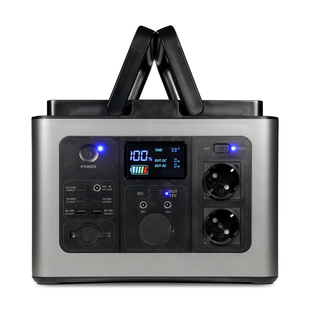 Портативне джерело живлення потужністю 700 Вт/230 В (чиста синусоїда), пікова потужність 900 Вт. Вбудована LiFePO4 акумуляторна батарея потужністю 640 Втг (12.8В/48Аг); вхід постійної напруги GX20 з максимальною потужністю 200 Вт з можливістю роботи від сонячних панелей, вбудований MPPT контролер заряду (макс 24В/200Вт); вхід постійної напруги DC5521 12-24В/120Вт; вихід USB (тип А): 2 шт. з максимальною потужністю 18 Вт кожен з режимом швидкої зарядки QC3.0: 5В/3А, 9В/2А, 12В/1.5А; PD вхід/вихід: 5В/3А, 9В/3А, 12В/3А, 15В/3А, 20В/5А (100 Вт макс); PD вихід: 2 шт. потужністю 20 Вт кожен; вихід DC: 2 шт. кожен 12В/10А; вихід автомобільної зарядки 12В/10А; режим «автовимкнення» через 30 сек; захист від перевантаження, перегріву, перерозряду, перенапруги; кількість циклів розряду-заряду АКБ ≥2000; час до повної зарядки АКБ 5.5-8 годин; 2 шт. вбудованих LED-прожектори 4 Вт; температура заряджання 0 °C ~ + 40 °C, робоча температура -10 °C ~ +40 °C; розміри 290 / 205 / 215 мм (з ручками 300 мм), пакування 440 / 290 / 320 мм; вага нетто 8.58 кг, брутто 10.38 кг