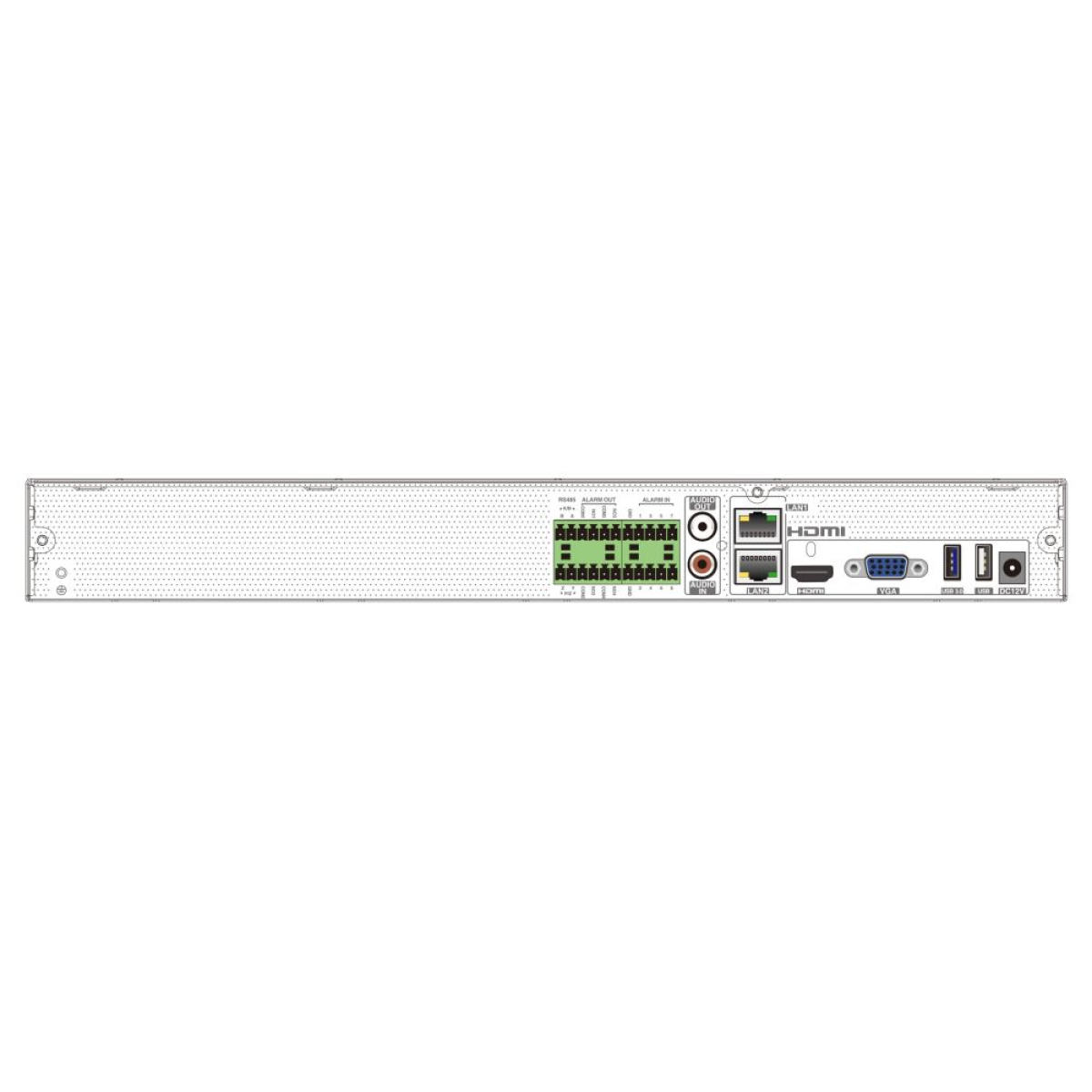 16-канальний мережевий відеореєстратор з підтримкою інтелектуальної відеоаналітики, з максимальною роздільною здатністю 16MP; відеокодек H.265+, H.265S, H.265, H.264; запис: 16MP / 12MP / 8MP / 6MP / 5MP / 4MP / 3MP / 1080P / 960P / 720P @ 25fps; вхідний/вихідний потоки 192Mbps/192Mbps; відеовихід: HDMI (4K), VGA (Full HD); аудіо: вхід RCA x1 / вихід RCA x1; тривожні: входи 8/виходи 4; база даних облич: 32 бібліотеки/10000 фото облич, порівняння облич: 18 зображень/сек; перегляд архіву камер: локально/мережею 16/16; мережа: RJ45 1000Mbps x2, USB 2.0 x2, USB 3.0 x1, HDD: SATA x2 до 10 ТБ; живлення DC 12V/4А; розміри 380 / 268 / 48.1 мм